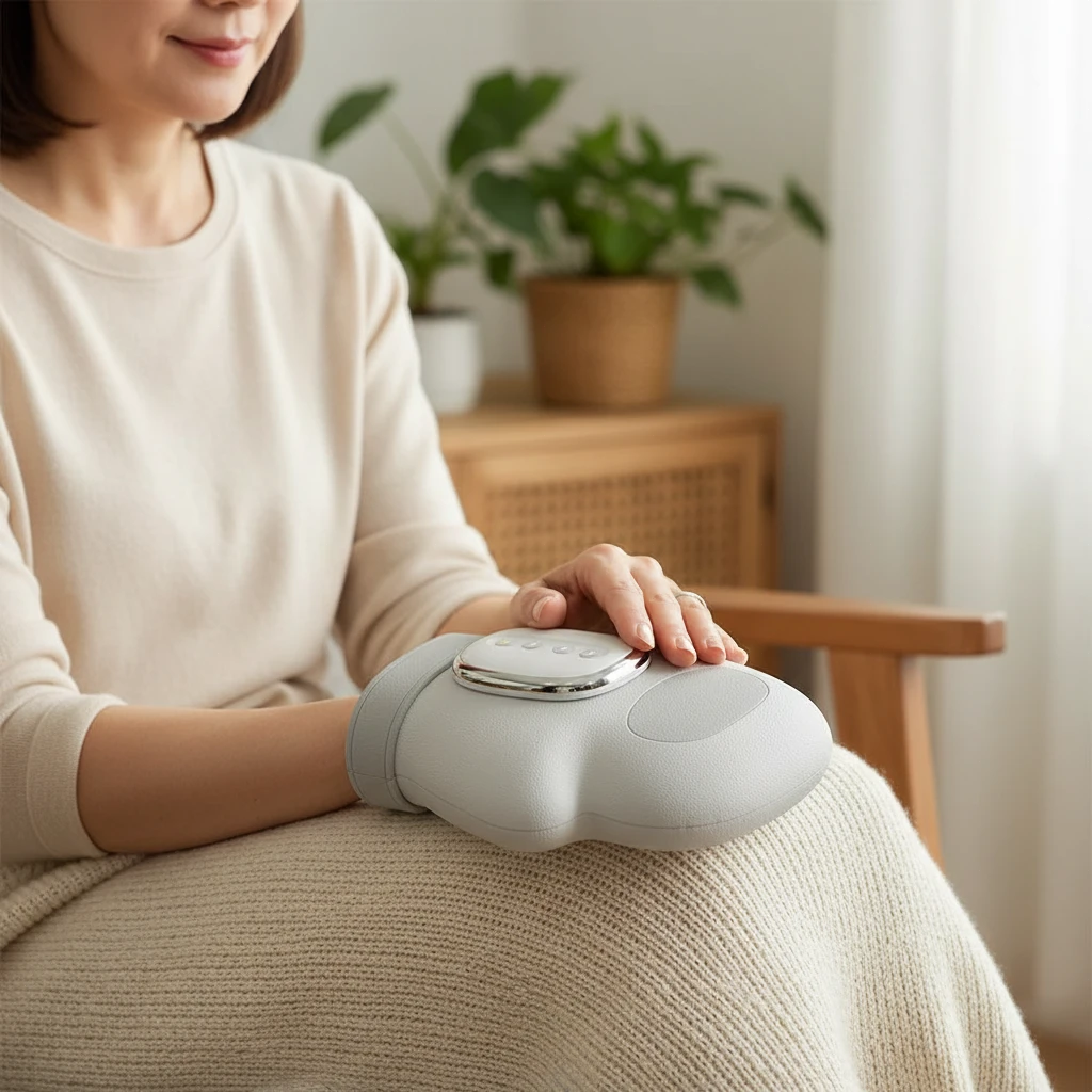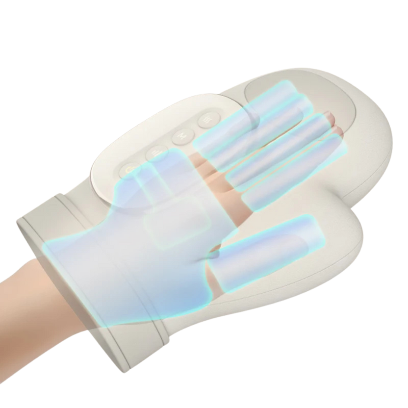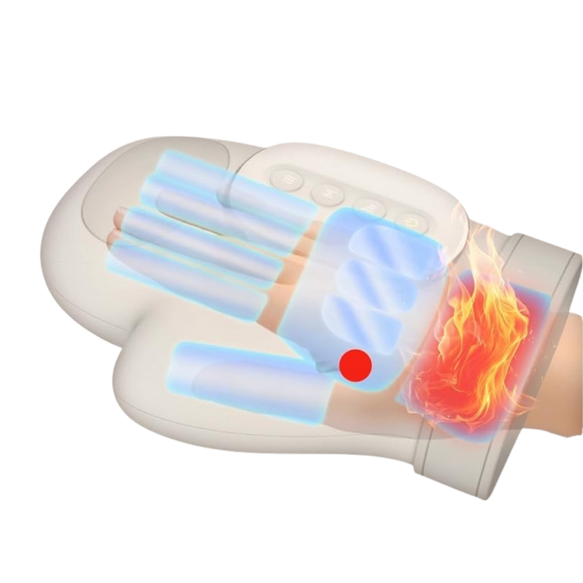 Therapeutisches Handmassagegerät mit fortschrittlicher Kompressions- und Wärmetherapie, entwickelt zur Linderung von Beschwerden bei Karpaltunnelsyndrom, Arthritis, Schnappfinger sowie durch wiederholte Belastung verursachten Handproblemen.