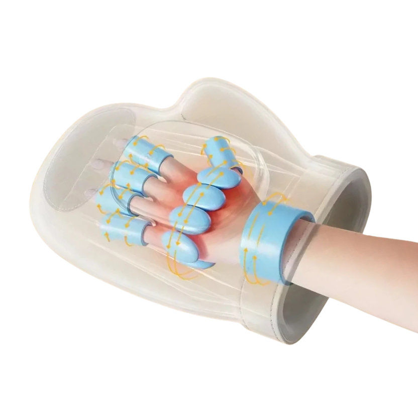 Dynamische Luftkammern üben sanften, rhythmischen Druck aufHandfläche, Finger und Handgelenkaus.